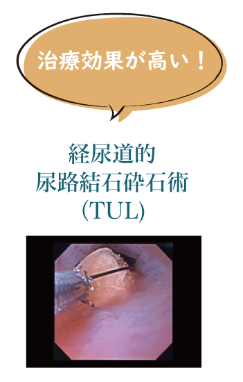 尿道から 細い内視鏡を入れて尿管または腎臓の結石をレーザや空気衝撃波などの砕 石装置で砕石します。数日~1週間以内の入院で治療可能。破砕された結石片は、手術中に体外に取り出すこと ができます。使用される内視鏡は、硬性内視鏡か軟性内視鏡のいずれかで、 治療部位により選択されます。治療効果の高い手術として近年増加してい ます。