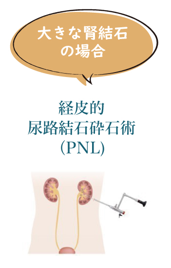 背中に小さな穴を開け、その穴から内視鏡を入れ、腎臓の結石を砕石、取り出す治療です。入院期間は、1~2 週間程度になります。比較的大きな腎結石に対して行われることが多い手術です。破砕した結石片は、比較的短時間で体外に取り出すことができます。反面、腎臓に穴をあけるので出血のリスクもあります。